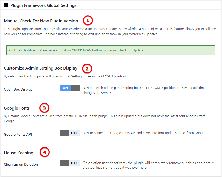 1. Manual Check For New Plugin Version – This plugin supports auto upgrades via your WordPress auto updates. Updates show within 24 hours of release. This feature allows you to call any new version for immediate upgrades instead of having to wait until they show in your WordPress updates.