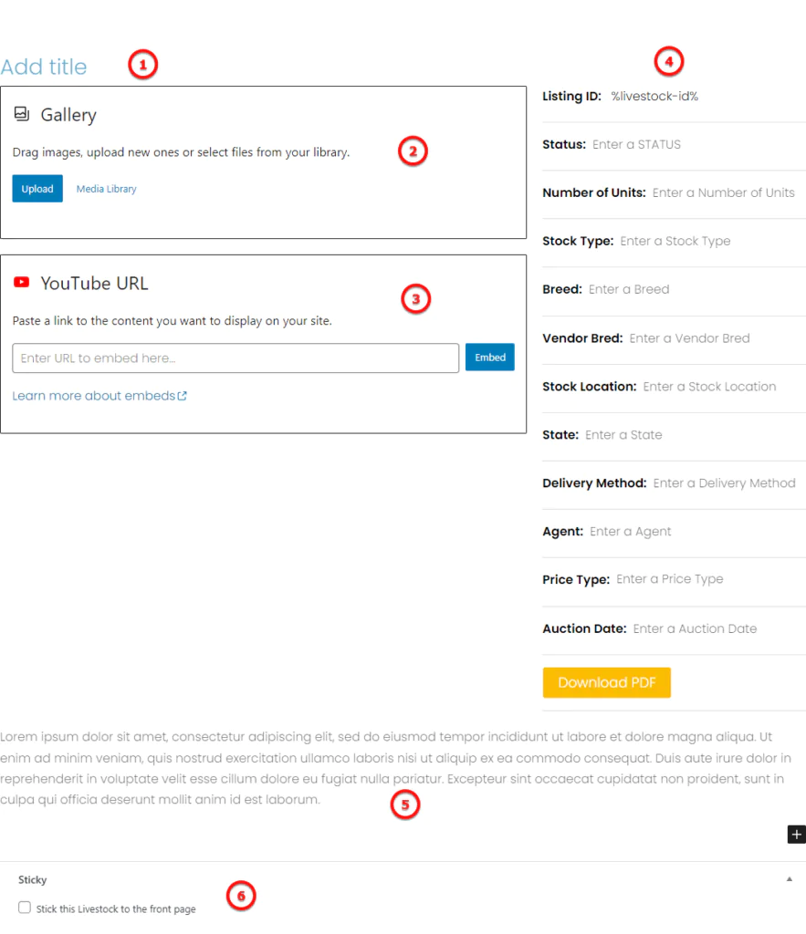 1. Add title – This is the item post title. It will also show as the title on the Livestock Card